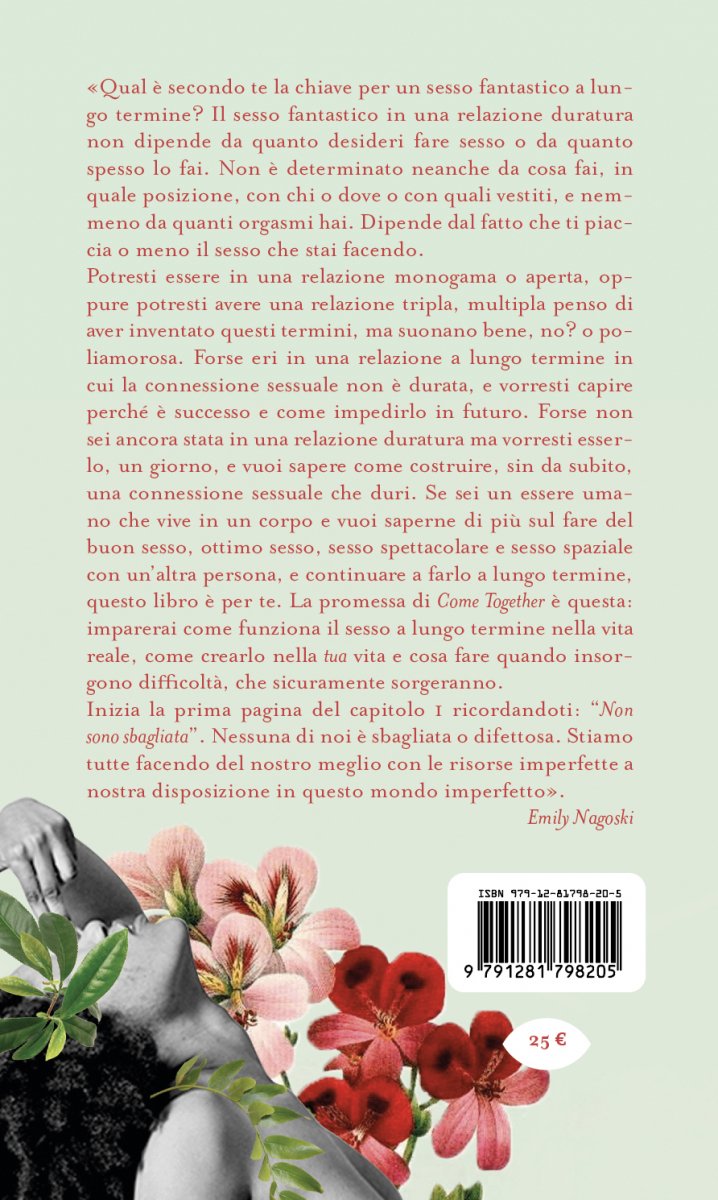 Cosa succede al desiderio quando l’infatuazione iniziale svanisce? Come si coltiva l’intimità sessuale in una relazione che dura nel tempo? In Come Together, Emily Nagoski ci guida con empatia e ironia attraverso la scienza (e l’arte!) della connessione sessuale duratura: con un approccio rivoluzionario, che fonde neuroscienze, psicologia e comprensione umana, smonta i miti sulla sessualità nelle relazioni a lungo termine – come l’idea che il desiderio spontaneo sia l’unico “vero” desiderio – e ci mostra che il vero fulcro del benessere sessuale sia il piacere, e non la frequenza o il desiderio. Tra le altre cose, l’Autrice esplora in che modo il contesto emotivo e relazionale influenzi profondamente l’esperienza sessuale, spiega la differenza tra desiderio spontaneo e reattivo, e perché entrambi siano pienamente validi, e propone delle strategie per creare un contesto condiviso favorevole al piacere, superando stress, insicurezze, blocchi emotivi e culturali legati alla sessualità, fino a costruire una comunicazione autentica e libera da giudizi (e pre-giudizi). Con il suo stile diretto e coinvolgente, attraverso storie vere, esercizi pratici e intuizioni illuminanti, Emily Nagoski offre quindi strumenti concreti per comunicare meglio con il partner, comprendere la propria “planimetria emozionale” e coltivare una sessualità che sia davvero autentica, gioiosa e sostenibile nel tempo. Dopo il successo internazionale di Come as You Are, Come Together è un libro destinato a diventare un nuovo punto di riferimento per chi cerca relazioni sessuali più autentiche e durature, un invito potente a riscoprire il piacere come atto di libertà personale e cura reciproca.