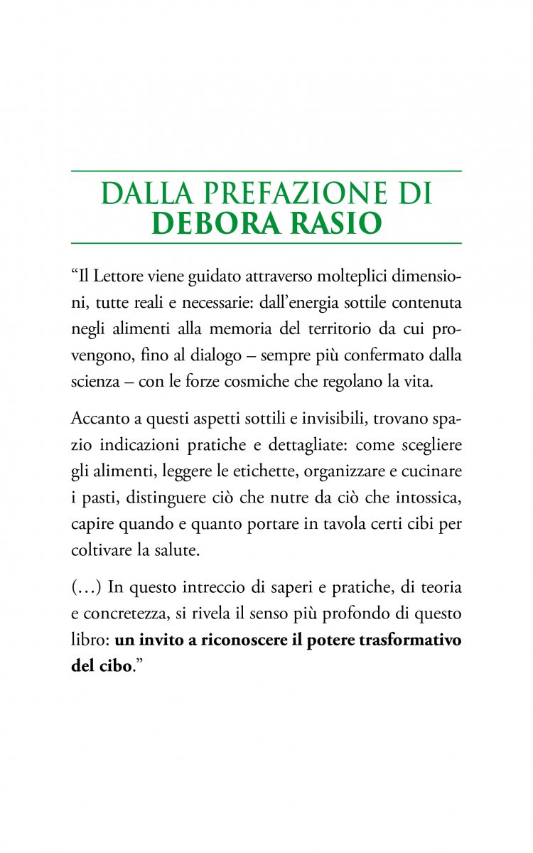 - Prefazione – Il potere trasformativo del cibo: a cura di Debora Rasio, famosa e popolare esperta e divulgatrice su temi medico-nutrizionali.