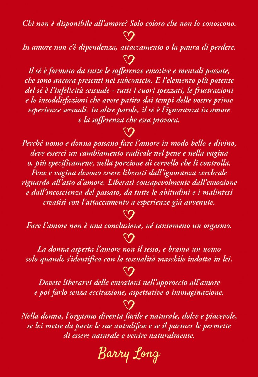 Perché uomo e donna possano fare l'amore in modo bello e divino, deve esserci un cambiamento radicale nel pene e nella vagina o, più specificamene, nella porzione di cervello che li controlla. Pene e vagina devono essere liberati dall'ignoranza cerebrale riguardo all'atto d’amore. Liberati consapevolmente dall'emozione e dall'incoscienza del passato, da tutte le abitudini e i malintesi creatisi con l'attaccamento a esperienze già avvenute.