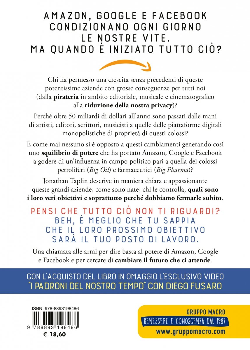 Jonathan Taplin nel suo libro I Nuovi Sovrani del Nostro Tempo - in America noto come "Move Fast and Break Things" - descrive in maniera chiara e appassionante queste grandi aziende, come sono nate, chi le controlla, quali sono i loro veri obiettivi e soprattutto perché dobbiamo fermarle subito!