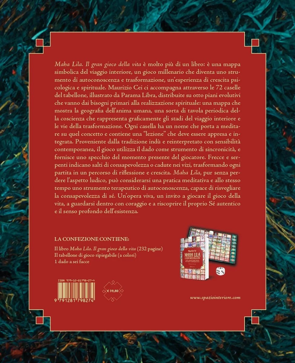 Maha Lila. Il gran gioco della vita è molto più di un libro: è una mappa simbolica del viaggio interiore, un gioco millenario che diventa uno strumento di autoconoscenza e trasformazione. Maurizio Cei ci accompagna attraverso le 72 caselle del tabellone, illustrato da Parama Libra, distribuite su otto piani evolutivi che vanno dai bisogni primari alla realizzazione spirituale: una mappa che mostra la geografia dell’anima umana, una sorta di tavola periodica della coscienza che rappresenta graficamente gli stadi del viaggio interiore e le vie della trasformazione. Ogni casella ha un nome che porta a meditare su quel concetto e contiene una “lezione” che deve essere appresa e integrata. Proveniente dalla tradizione indù e reinterpretato con sensibilità contemporanea, il gioco utilizza il dado (non incluso) come strumento di sincronicità, e fornisce uno specchio del momento presente del giocatore. Frecce e serpenti indicano salti di consapevolezza o cadute nei vizi, trasformando ogni partita in un percorso di riflessione e crescita. Maha Lila può considerarsi una pratica meditativa e allo stesso tempo uno strumento terapeutico di autoconoscenza, capace di risvegliare la consapevolezza di sé. Un’opera viva, un invito a giocare seriamente il gioco della vita, a guardarsi dentro con coraggio e a riscoprire il proprio Sé autentico e il senso profondo dell’esistenza.